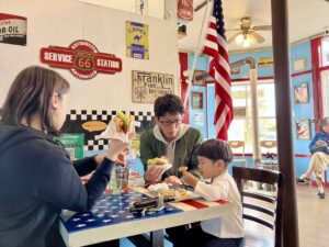 カヌー体験のあとは、JR塘路駅のすぐそば、Mrs. GREEN APPLEがTV番組の中で、廃校となる塘路小学校の生徒さんと一緒に食べに来たことで一躍聖地となった「Bob’s Burger(ボブズバーガー)」さんでランチタイムです。美味しいハンバーガーを楽しみながら、会員同士の親交を深め、明日への英気を養うことが出来ました。