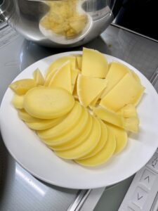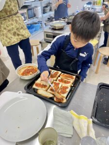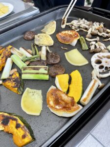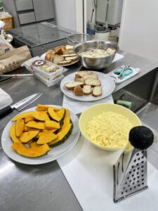 当日は河﨑牧場さんの3種類のチーズ(ゴーダ・カチョカバロ・ストリング)を使って、手間を掛けずに、簡単に普段の食事にも取り入れる事が出来るようなチーズの楽しみ方を色々と教えていただきました。季節の野菜とチーズをホットプレートで焼き、一緒に食べることで「野菜の甘みがこんなにも増すとは!」と、皆、驚きながら秋の味覚をお腹いっぱいに堪能することが出来ました。また、市販のパンを使って簡単なピザを作ったのですが、ピザソースをあっという間に手作り出来るレシピも教えていただき、私の密かな収穫です。